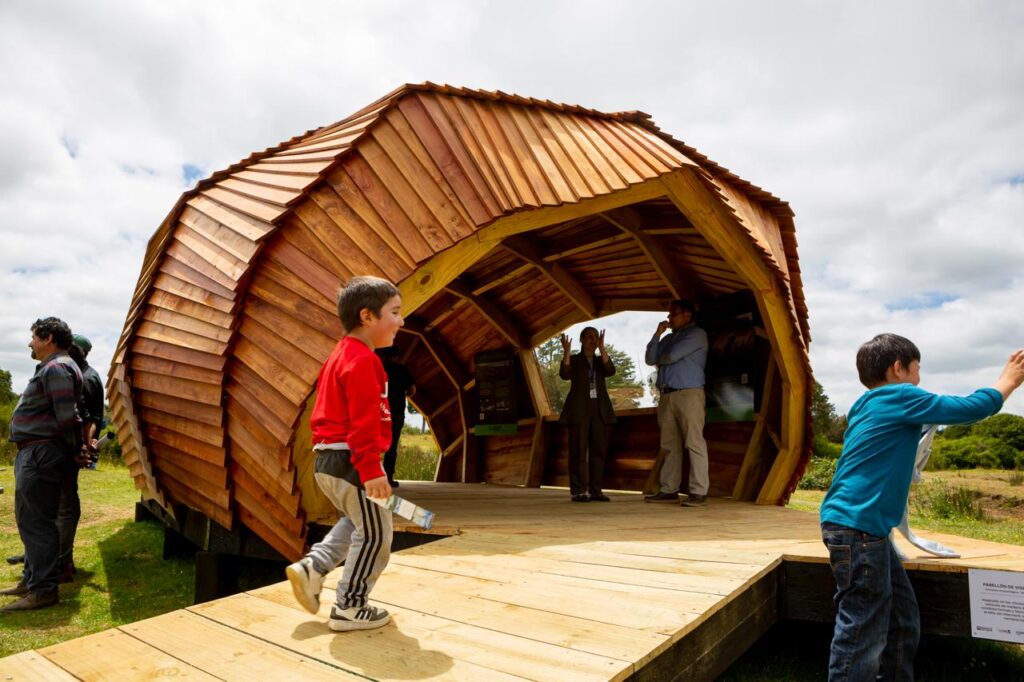 La estructura reposa sobre el suelo, sin intervenirlo, y es íntegramente elaborada en madera de roble y pino impregnado, trabajos que fueron aprobados por profesionales de la Secretaría Comunal de Planificación (Secplan).